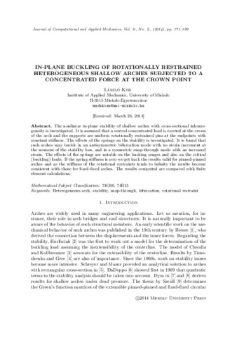 Kiss, László Péter (2014) In-plane Buckling of Rotationally Restrained Heterogeneous Shallow Arches Subjected to a Concentrated Force at the Crown Point. JOURNAL OF COMPUTATIONAL AND APPLIED MECHANICS, 9 (2). pp. 171-199. ISSN 1586-2070