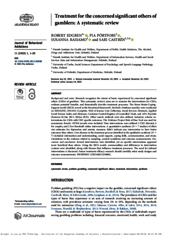 Edgren, Robert and Pörtfors, Pia and Raisamo, Susanna and Castrén, Sari (2022) Treatment for the concerned significant others of gamblers: A systematic review. JOURNAL OF BEHAVIORAL ADDICTIONS, 11 (1). pp. 1-25. ISSN 2062-5871 (print); 2063-5303 (online)