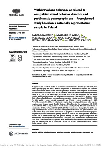 Lewczuk, Karol and Wizła, Magdalena and Glica, Agnieszka and Potenza, Marc N. and Lew-Starowicz, Michał and Kraus, Shane W. (2022) Withdrawal and tolerance as related to compulsive sexual behavior disorder and problematic pornography use – Preregistered study based on a nationally representative sample in Poland. Journal of Behavioral Addictions, 11 (4). pp. 979-993. ISSN 2062-5871