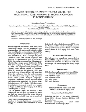 Páll-Gergely, Barna and Grego, Jozef (2022) A new species of Endothyrella Zilch, 1960 from Nepal (Gastropoda: Stylommatophora: Plectopylidae). JOURNAL OF CONCHOLOGY, 44 (4). pp. 343-347. ISSN 0022-0019