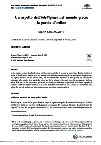 Santagati, Elena (2023) Un aspetto dell'intelligence nel mondo greco: la parola d'ordine. ACTA ANTIQUA ACADEMIAE SCIENTIARUM HUNGARICAE, 63 (1). pp. 9-24. ISSN 0044-5975 (print); 1588-2543 (online)
