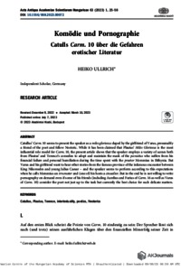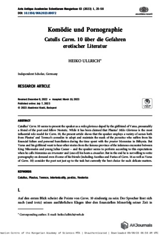 Ullrich, Heiko (2023) Komödie und Pornographie : Catulls Carm. 10 über die Gefahren erotischer Literatur. ACTA ANTIQUA ACADEMIAE SCIENTIARUM HUNGARICAE, 63 (1). pp. 25-58. ISSN 0044-5975 (print); 1588-2543 (online)