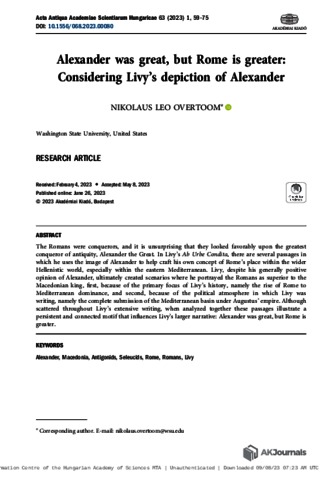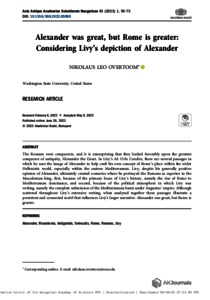 Overtoom, Nikolaus Leo (2023) Alexander was Great, but Rome is Greater: Considering Livy's Depiction of Alexander. ACTA ANTIQUA ACADEMIAE SCIENTIARUM HUNGARICAE, 63 (1). pp. 59-75. ISSN 0044-5975 (print); 1588-2543 (online)