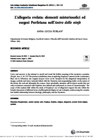 Furlan, Anna Lucia (2023) L’allegoria svelata: elementi misteriosofici ed esegesi Porfiriana nell’Antro delle ninfe. ACTA ANTIQUA ACADEMIAE SCIENTIARUM HUNGARICAE, 63 (1). pp. 103-119. ISSN 0044-5975 (print); 1588-2543 (online)
