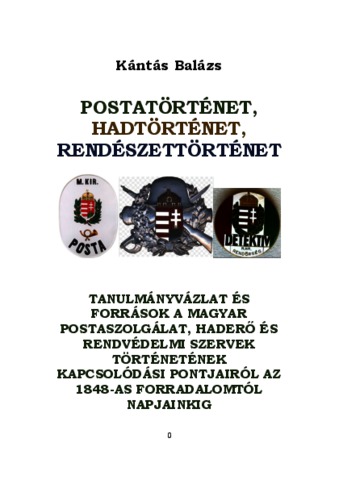 Kántás, Balázs (2023) Postatörténet, hadtörténet, rendészettörténet : tanulmányvázlat és források a magyar postaszolgálat, haderő és rendvédelmi szervek történetének kapcsolódási pontjairól az 1848-as forradalomtól napjainkig. Horthy-korszak Történetének Kutatásáért Társaság, Budapest. ISBN 9786156250803