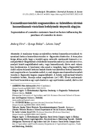 Amberg, Nóra and Gyenge, Balázs and Lehota, József (2022) Kozmetikumvásárlók szegmentálása az üzletekben történő kozmetikumok vásárlását befolyásoló tényezők alapján = Segmentation of Cosmetics Customers based on Factors Influencing the Purchase of Cosmetics in Stores. GAZDASÁG ÉS TÁRSADALOM : TÁRSADALOMTUDOMÁNYI FOLYÓIRAT, 15(33) (4). pp. 88-115. ISSN 0865-7823