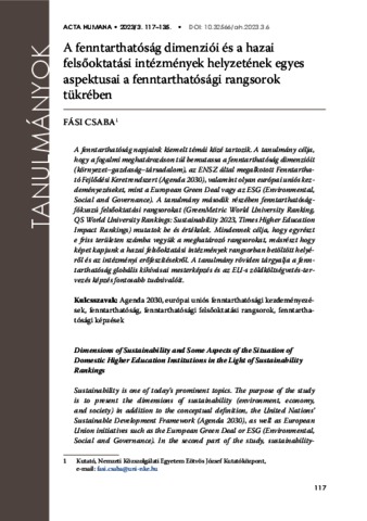 Fási, Csaba (2023) A fenntarthatóság dimenziói és a hazai felsőoktatási intézmények helyzetének egyes aspektusai a fenntarthatósági rangsorok tükrében. ACTA HUMANA : EMBERI JOGI KÖZLEMÉNYEK, 11 (3). pp. 117-135. ISSN 0866-6628 (nyomtatott); 2786-0728 (elektronikus)