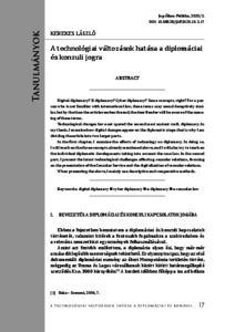 Digital diplomacy? E-diplomacy? Cyber diplomacy? Same concepts, right? For a person who is not familiar with international law, these terms may sound deceptively similar, but by the time the article reaches the end, the dear Reader will be aware of the meaning of these terms. Technological changes have not spared the second most ancient craft, diplomacy. In my thesis, I examine how digital changes appear on the diplomatic stage. that is why I am dividing the article into two larger parts. In the first chapter, I examine the effects of technology on diplomacy. In doing so, I will touch on the three concepts already mentioned above, and I will also try to touch on the individual diplomatic developments taking into account the case law. In the second part, I present the latest technological challenges affecting consular relations, focusing on the presentation of the Consular Service and the digitalization of consular relations. When presenting the above, I mainly use descriptive and comparative methods.