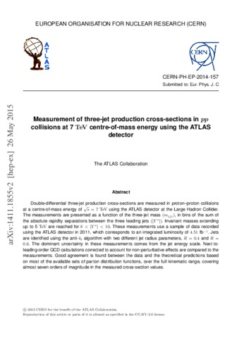 Aad, G. and Abbott, B. and Abdallah, J. and Khalek, S. A. and Abdinov, O. and Krasznahorkay, Attila and Nagai, Yoshikazu and Pásztor, Gabriella and Tóth, József (2015) Measurement of three-jet production cross-sections in pp collisions at 7 TeV centre-of-mass energy using the ATLAS detector. EUROPEAN PHYSICAL JOURNAL C, 75 (5). ISSN 1434-6044