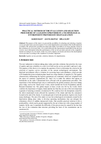 Nagy, Gábor and Bányai, Ágota and Illés, Béla László (2023) Practical method of the evaluation and selection procedure of a logistics provider in a technological environment provided by digitalization. ADVANCED LOGISTIC SYSTEMS: THEORY AND PRACTICE, 17 (2). pp. 23-35. ISSN 1789-2198