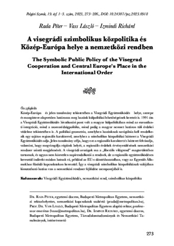 Rada, Péter and Vass, László and Izmindi, Richárd (2023) A visegrádi szimbolikus közpolitika és Közép-Európa helye a nemzetközi rendben = The Symbolic Public Policy of the Visegrad Cooperation and Central Europe's Place in the International Order. POLGÁRI SZEMLE: GAZDASÁGI ÉS TÁRSADALMI FOLYÓIRAT, 19 (1-3). pp. 273-286. ISSN 1786-6553