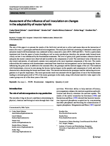 Kálmán, Csaba Dániel and Kálmán, László and Szél, Sándor and Mórocz Salamon, Katalin and Nagy, Zoltán and Kiss, Erzsébet and Posta, Katalin (2023) Assessment of the influence of soil inoculation on changes in the adaptability of maize hybrids. CEREAL RESEARCH COMMUNICATIONS, 51 (4). pp. 1055-1071. ISSN 0133-3720 (print), 1788-9170 (online)