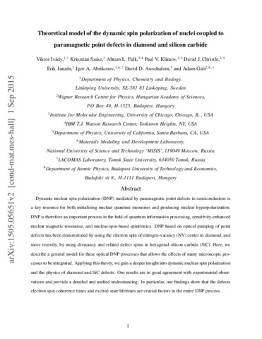 Ivády, Viktor and Szász, Krisztián and Falk, A. L. and Klimov, P. V. and Christle, D. J. and Gali, Ádám (2015) Theoretical model of dynamic spin polarization of nuclei coupled to paramagnetic point defects in diamond and silicon carbide. PHYSICAL REVIEW B, 92 (11). ISSN 2469-9950