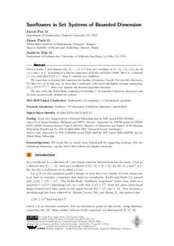 Fox, Jacob and Pach, János and Suk, Andrew (2021) Sunflowers in set systems of bounded dimension. In: 37th International Symposium on Computational Geometry, SoCG 2021. Leibniz-Zentrum für Informatik, Wadern, pp. 571-583. ISBN 9783959771849