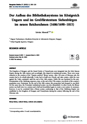 Monok, István (2023) Der Aufbau des Bibliothekssystems im Königreich Ungarn und im Großfürstentum Siebenbürgen im neuen Reichsrahmen (1686/1690–1815). HUNGARIAN STUDIES: A JOURNAL OF THE INTERNATIONAL ASSOCIATION FOR HUNGARIAN STUDIES AND BALASSI INSTITUTE, 37 (S). pp. 105-118. ISSN 0236-6568