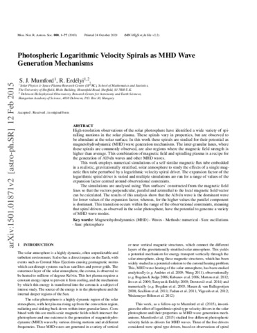 Mumford, S. J. and Erdélyi, Róbert (2015) Photospheric logarithmic velocity spirals as MHD wave generation mechanisms. MONTHLY NOTICES OF THE ROYAL ASTRONOMICAL SOCIETY, 449 (2). pp. 1679-1685. ISSN 0035-8711