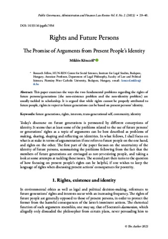 Könczöl, Miklós (2023) Rights and Future Persons : The Promise of Arguments from Present People’s Identity. PUBLIC GOVERNANCE ADMINISTRATION AND FINANCES LAW REVIEW, 8 (2). pp. 29-40. ISSN 2498-6275