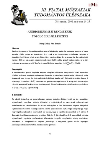 Bitay, Enikő and Réti, Tamás (2006) Aperiodikus sejtrendszerek topológiai jellemzése. In: XI. FMTÜ Nemzetközi Tudományos Konferencia. Societatea Muzeului Ardelean; Transilvanian Museum Society, Kolozsvár, pp. 47-56. ISBN 9738231507