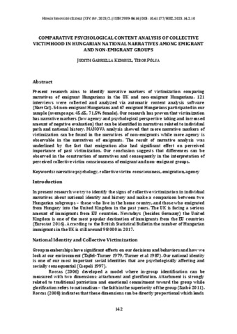 Kengyel, Judith Gabriella and Pólya, Tibor (2023) Comparative Psychological Content Analysis of Collective Victimhood in Hungarian National Narratives Among Emigrant and Non-Emigrant Groups. HUMÁN INNOVÁCIÓS SZEMLE, 14 (2). pp. 142-154. ISSN 2062-0292