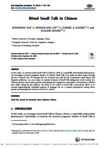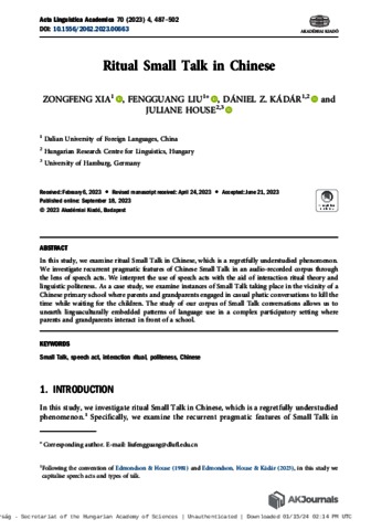 Xia, Zongfeng and Liu, Fengguang and Kádár, Dániel Z. and House, Juliane (2023) Ritual Small Talk in Chinese. Acta Linguistica Academica, 70 (4). pp. 487-502. ISSN 2559-8201