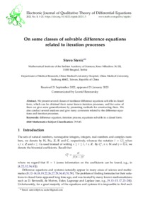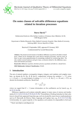 Stevic, Stevo (2023) On some classes of solvable difference equations related to iteration processes. ELECTRONIC JOURNAL OF QUALITATIVE THEORY OF DIFFERENTIAL EQUATIONS, 2023 (5). pp. 1-23. ISSN 1417-3875