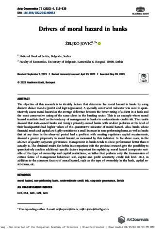 Jović, Željko (2023) Drivers of moral hazard in banks. ACTA OECONOMICA, 73 (4). pp. 519-535. ISSN 0001-6373