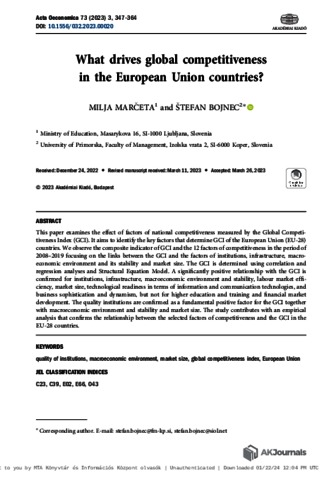 Marceta, Milja and Bojnec, Stefan (2023) What drives global competitiveness in the European Union countries? ACTA OECONOMICA, 73 (3). pp. 347-364. ISSN 0001-6373