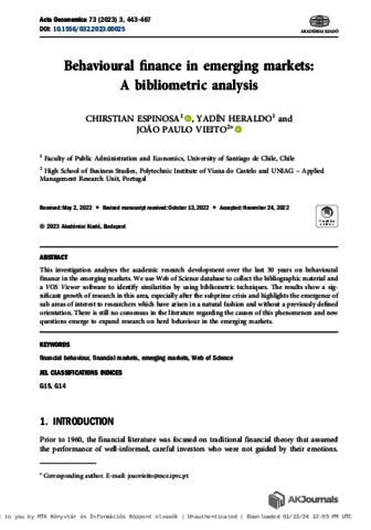 Espinosa, Chirstian and Heraldo, Yadín and Vieito, João Paulo (2023) Behavioural finance in emerging markets: A bibliometric analysis. ACTA OECONOMICA, 73 (3). pp. 443-467. ISSN 0001-6373