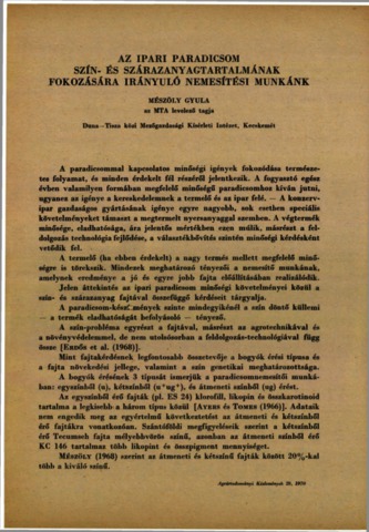 Mészöly, Gyula (1970) Az ipari paradicsom szín- és szárazanyagtartalmának fokozására irányuló nemesítési munkánk. AGRÁRTUDOMÁNYI KÖZLEMÉNYEK : A MAGYAR TUDOMÁNYOS AKADÉMIA AGRÁRTUDOMÁNYOK OSZTÁLYÁNAK KÖZLEMÉNYEI, 29 (3). pp. 219-225. ISSN 0002-1113