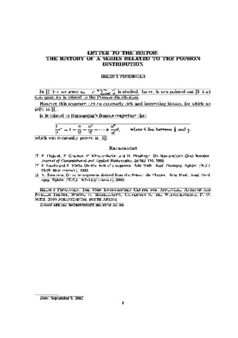 Prodinger, H. (2002) Letter to the editor: The history of a series related to the Poisson distribution. ACTA MATHEMATICA ACADEMIAE PAEDAGOGICAE NYÍREGYHÁZIENSIS, 18 (2). ISSN 0866-0174