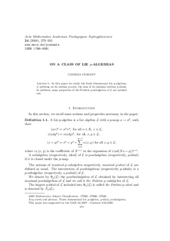 Ciobanu, Camelia (2008) On a class of Lie p-algebras. ACTA MATHEMATICA ACADEMIAE PAEDAGOGICAE NYÍREGYHÁZIENSIS, 24 (3). pp. 279-285. ISSN 0866-0174