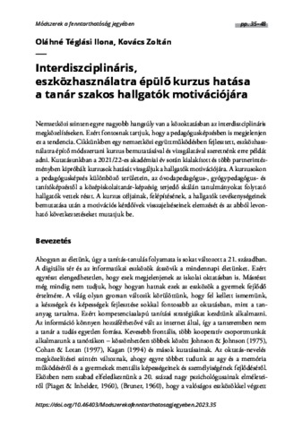 Oláhné Téglási, Ilona and Kovács, Zoltán (2023) Interdiszciplináris, eszközhasználatra épülő kurzus hatása a tanár szakos hallgatók motivációjára. In: Módszerek a fenntarthatóság jegyében : Pedagógiai és szakmódszertani tanulmányok. Eszterházy Károly Katolikus Egyetem Líceum Kiadó, Eger, pp. 35-48.