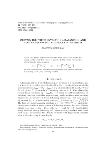 Prasanta Kumar, Ray (2023) Certain identities involving k-balancing and k-Lucas-balancing numbers via matrices. ACTA MATHEMATICA ACADEMIAE PAEDAGOGICAE NYÍREGYHÁZIENSIS, 34 (1). pp. 120-130. ISSN 1786-0091