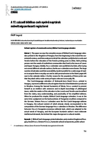 Papp, Ingrid (2023) A 17. századi biblikus cseh nyelvű naptárak műveltségszerkezeti regiszterei = Cultural Registers of Seventeenth-century Biblical Czech-language Calendars. IRODALOMTÖRTÉNETI KÖZLEMÉNYEK : AZ ELKH BÖLCSÉSZETTUDOMÁNYI KUTATÓKÖZPONT IRODALOMTUDOMÁNYI INTÉZETÉNEK FOLYÓIRATA, 127 (6). pp. 711-730. ISSN 0021-1486 (nyomtatott); 1588-0834 (elektronikus)