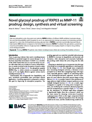 Abdou, Moaz M. and Ötvös, Ferenc and Dong, Dewen and Matziari, Magdalini (2023) Novel glycosyl prodrug of RXP03 as MMP-11 prodrug: design, synthesis and virtual screening. BMC CHEMISTRY, 17 (1). No.-167. ISSN 2661-801X