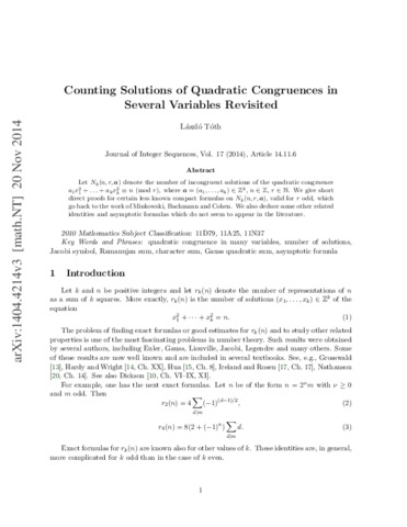 Tóth, László (2014) Counting Solutions of Quadratic Congruences in Several Variables Revisited. JOURNAL OF INTEGER SEQUENCES, 17 (11). ISSN 1530-7638