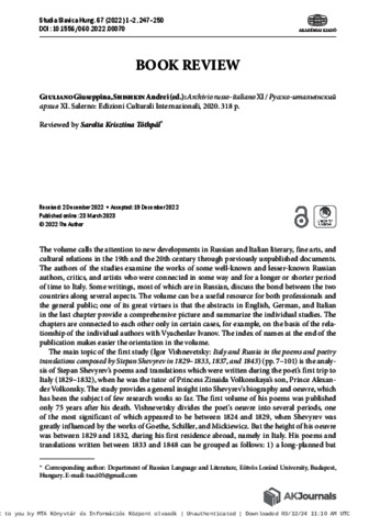 Tóthpál, Sarolta Krisztina (2022) Giuliano Giuseppina, Shishkin Andrei (ed.): Archivio russo-italiano XI / Русско-итальянский архив XI. STUDIA SLAVICA ACADEMIAE SCIENTIARUM HUNGARICAE, 67 (1-2). pp. 247-250. ISSN 0039-3363