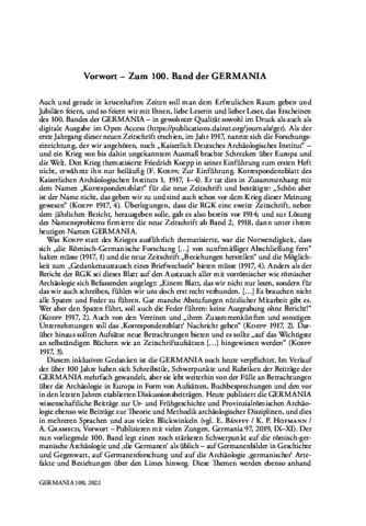 Bánffy, Eszter and Hofmann, Kerstin P. and Gramsch, Alexander (2022) Vorwort – Zum 100. Band der GERMANIA. GERMANIA, 100. pp. 7-9. ISSN 0016-8874