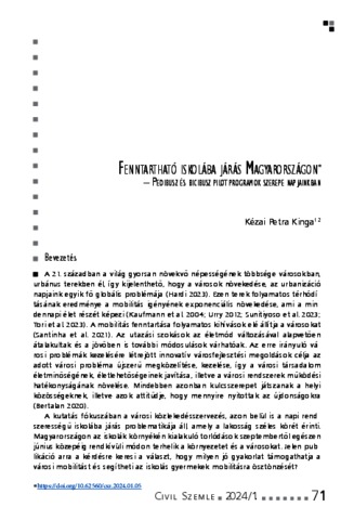 Kézai, Petra Kinga (2024) Fenntartható iskolába járás Magyarországon : Pedibusz és bicibusz pilotprogramok szerepe napjainkban. CIVIL SZEMLE, 21 (1). pp. 71-88. ISSN 1786-3341