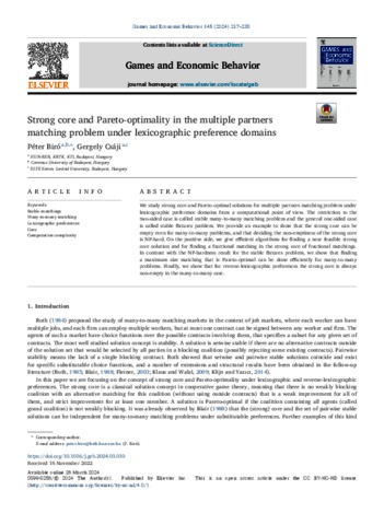 Biró, Péter and Csáji, Gergely Kál (2024) Strong core and Pareto-optimality in the multiple partners matching problem under lexicographic preference domains. GAMES AND ECONOMIC BEHAVIOR, 145. pp. 217-238. ISSN 0899-8256