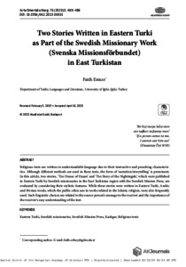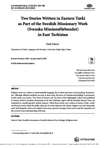 Erbay, Fatih (2023) Two Stories Written in Eastern Turki as Part of the Swedish Missionary Work (Svenska Missionsforbundet) in East Turkistan. ACTA ORIENTALIA ACADEMIAE SCIENTIARUM HUNGARICAE, 76 (3). pp. 469-486. ISSN 0001-6446