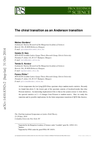 Giordano, Matteo and Katz, Sándor and Kovács, T. G. and Pittler, Ferenc (2014) The chiral transition as an Anderson transition. POS - PROCEEDINGS OF SCIENCE. ISSN 1824-8039
