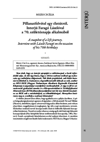 Mezei, Cecília (2023) Pillanatfelvétel egy életútról. Interjú Faragó Lászlóval a 70. születésnapja alkalmából = A snapshot of a life journey. Interview with László Faragó on the occasion of his 70th birthday. COMITATUS: ÖNKORMÁNYZATI SZEMLE, 33 (246). pp. 13-20. ISSN 1215-315X