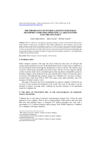 Kruchina, Vince and Illés, Béla and Tamás, Péter (2023) The importance of inverse logistics for public transport companies operating a large battery electric bus fleet. ADVANCED LOGISTIC SYSTEMS: THEORY AND PRACTICE, 17 (4). pp. 23-32. ISSN 1789-2198