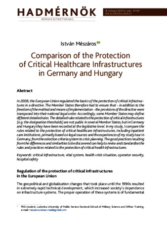 In 2008, the European Union regulated the basics of the protection of critical infrastructures in a directive. The Member States therefore had to ensure that – in addition to the freedom of the method and means of implementation – the provisions of the directive were transposed into their national legal order. Accordingly, some Member States may define different detailed rules. The detailed rules related to the protection of critical infrastructures (e.g. the designation thresholds) are not public in several Member States, but in Germany and Hungary they have been recorded at the legislative level. In my study, I compare the rules related to the protection of critical healthcare infrastructures, including inpatient care institutions, primarily based on legal sources and the experiences of my study tour in Germany, from the selection criteria system to crisis planning. The good practices resulting from the differences and similarities to be discovered can help to revise and standardise the rules and practices related to the protection of critical health infrastructures.