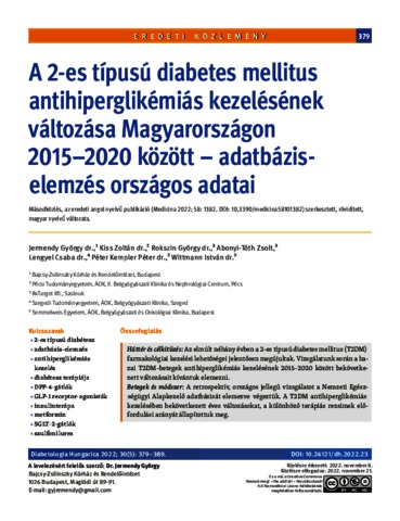 Jermendy, György and Kiss, Zoltán and Rokszin, György Aurél and Abonyi-Tóth, Zsolt and Lengyel, Csaba Attila and Kempler, Péter and Wittmann, István (2022) A 2-es típusú diabetes mellitus antihiperglikémiás kezelésének változása Magyarországon 2015-2020 között - adatbázis-elemzés országos adatai [Changing patterns of antihyperglycaemic treatment among patients with type 2 diabetes in Hungary between 2015 and 2020 – nationwide data from a register-based analysis]. DIABETOLOGIA HUNGARICA, 30 (5). pp. 379-389. ISSN 1217-372X
