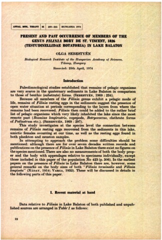 Sebestyén, Olga (1974) Present and past occurrence of members of the genus Filinia Bory de St. Vincent, 1826 (Testudinellidae Rotatoria) in Lake Balaton. A Magyar Tudományos Akadémia Tihanyi Biológiai Kutatóintézetének évkönyve, 41. pp. 289-315. ISSN 0365-3005