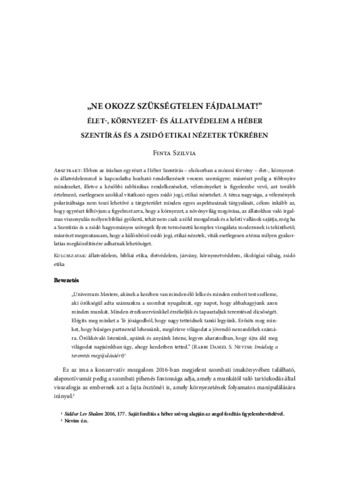 Ebben az írásban egyrészt a Héber Szentírás – elsősorban a mózesi törvény – élet-, környezet- és állatvédelemmel is kapcsolatba hozható rendelkezéseit veszem szemügyre; másrészt pedig a többnyire mindezeket, illetve a későbbi rabbinikus rendelkezéseket, véleményeket is •gyelembe vevő, azt tovább értelmező, esetlegesen azokkal vitatkozó egyes zsidó jogi, etikai nézeteket. A téma nagysága, a vélemények polarizáltsága nem teszi lehetővé a tárgyterület minden egyes aspektusának tárgyalását, célom inkább az, hogy egyrészt felhívjam a •gyelmet arra, hogy a környezet, a növényvilág megóvása, az állatokhoz való irgalmas viszonyulás mélyen bibliai gyökerű, tehát nem csak a zöld mozgalmak és a keleti vallások sajátja, még ha a Szentírás és a zsidó hagyományos szövegek ilyen természetű komplex vizsgálata modernnek is tekinthető; másrészt megmutassam, hogy a különböző zsidó jogi, etikai nézetek, viták esetlegesen a téma milyen gyakorlatias megközelítésére adhatnak lehetőséget.