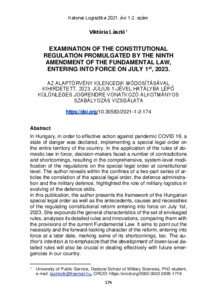 László, Viktória (2021) Examination of the constitutional regulation promulgated by the ninth amendment of the fundamental law, entering into force on July 1st, 2023. KATONAI LOGISZTIKA, 29 (1-2). pp. 174-192. ISSN 1588-4228