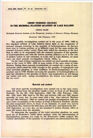 Oláh, János (1970) Short periodic changes in the microbial plankton quantity of Lake Balaton. A Magyar Tudományos Akadémia Tihanyi Biológiai Kutatóintézetének évkönyve, 37. pp. 199-207. ISSN 0365-3005